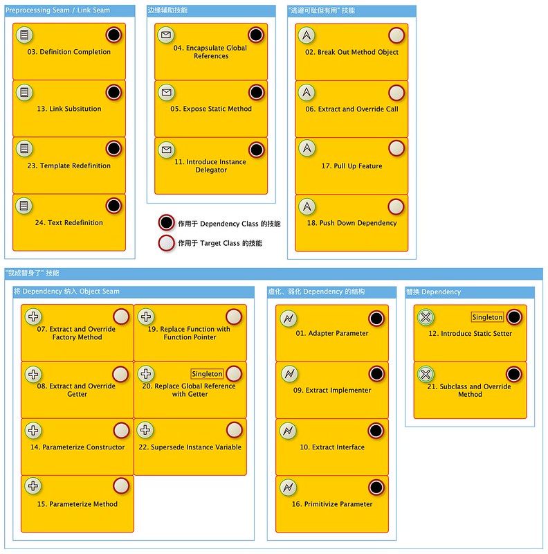 灾难的 Chapter 25!一共 24 个技能,作者发了疯按技能名字的 alphabet 排序!然后这些名字还是作者自己起的,所以这个顺序本质上是随机的!大哥你好歹分一下类吧?有的技巧是修改测试目标类、有的是修改 dependency,大部分是 object seam 的范畴、小部分是 link seam/preprocessing seam。你就大喇喇地 24 条一起扔那儿,这样好吗?这样不好!