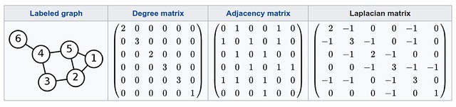 \[L_{i,j}:={\begin{cases}\deg(v_{i})&{\mbox{if}}\ i=j\\-1&{\mbox{if}}\ i\neq j\ {\mbox{and}}\ v_{i}{\mbox{ is adjacent to }}v_{j}\\0&{\mbox{otherwise}}\end{cases}}\]E.g., here is a simple example of undirected graph and its Laplacian matrix.