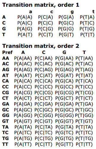 - Each row specifies one prefix (the $m$ preceding nucleotides), each column one suffix (the current nucleotide).