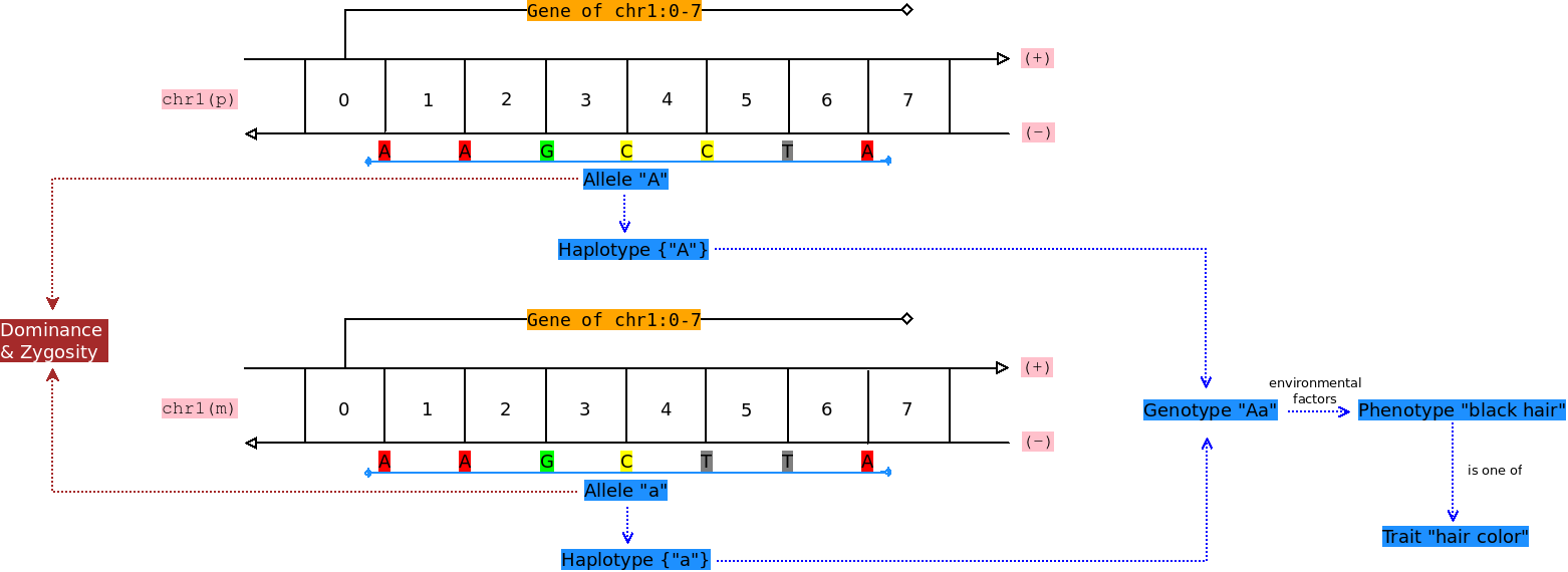 回到问题一,若我们假定 chr1(+):0-7 是一个 gene,它控制头发的颜色,那么所有人的 chr1(+):0-7 应该都是这个控制头发颜色的 gene region。是 gene 的 allele、haplotype、genotype 的不同才导致了人有不同的头发颜色。