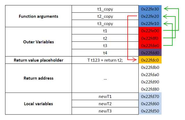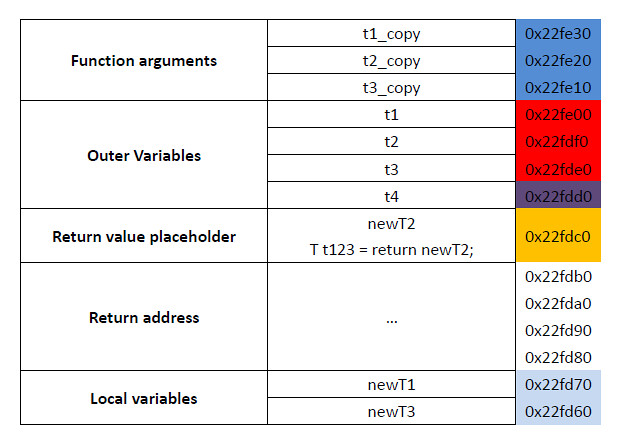 如果我们是返回一个 local variable,情况会有很大的不同。我们把 main 里的 T t123 = foo(t1, t2, t3); 改成 T t123 = bar(t1, t2, t3); 再运行一遍,得到: