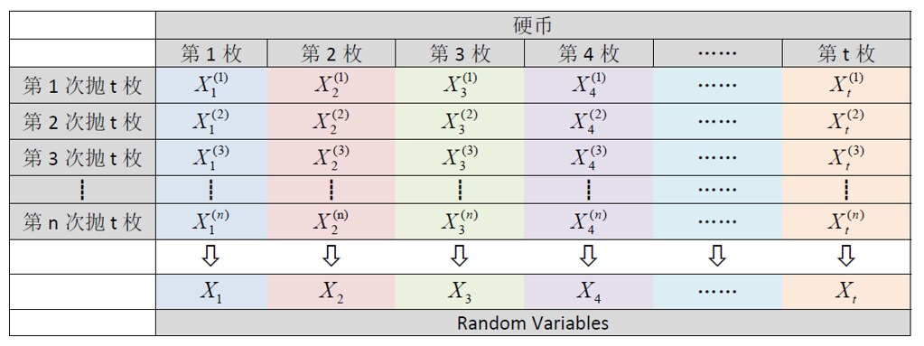 - 假设有这么一个试验:在单次试验 $X^{(i)}$ 中,我们要抛 $t$ 次硬币,分别得到 $X_1^{(i)},X_2^{(i)},\dots,X_n^{(i)}$ 这 $t$ 个结果