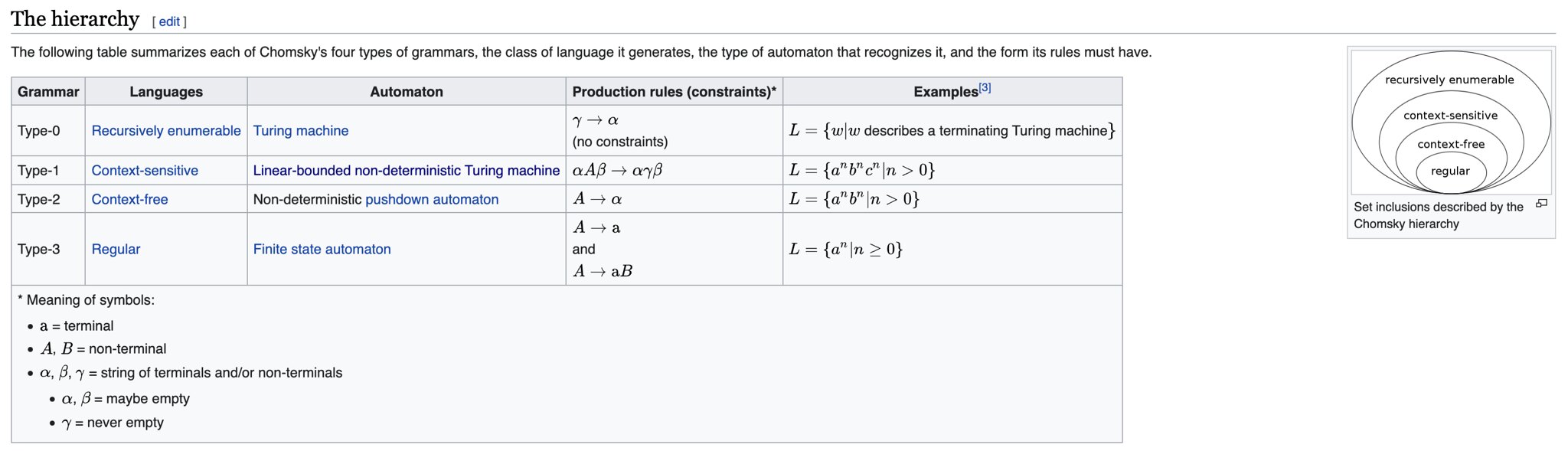 问题下面还有一位 Basile Starynkevitch 的 comment,提到了 Chomsky hierarchy,哪天需要重学 Languages vs Automation 的时候可以参考下。这张表和这个图在教材里竟然看不到我也是不理解……