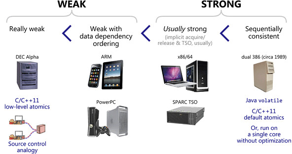 我觉得某种程度上这么说 ok,但我顺着这个思路想:会不会 weak memory models 就是 allows all reorderings? 答案是 nope!比如 ARM/POWER 其实有 coherence 特性: