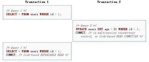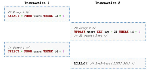 Transaction 1 的执行的第二个 query 会读到 Transaction 2 中 update 的结果,如果 Transaction 2 rollback 的话,这个读到的数据明显是错误的。