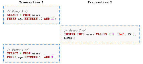 当 Transaction 1 执行一个 range query(范围查询,如 like, between 等)时,只会为涉及到的 row 加 read lock,如果插入一个新 row 在 range 之内,第二次 range query 还是会被读出。