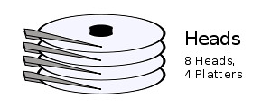 一个 disk drive 包括两个移动部件:disk assembly (磁盘组合) 和 head assembly (磁头组合)。disk assembly 是盘片 (platter) 的集合,一个盘片有2个盘面 (side)。head assembly 是磁头 (head) 的集合,一个盘面一个磁头。