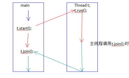 如果 t.start() 之后,main 又调用 t.join(),(假设此时 t 还没跑完)则此时 main 就像调用一个普通方法一样(比如第一幅图的 m1()),main 要等 t 执行完之后才能继续执行 t.join() 之后的代码,称为 “将 t 合并到主线程”