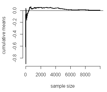 plot(1:n, means, type = "l", lwd = 2, frame = FALSE, ylab = "cumulative means", xlab = "sample size")