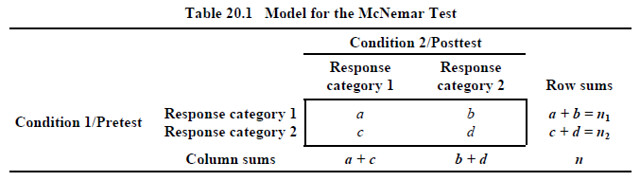 The 2×2 table depicted in Table 20.1 summarizes the McNemar test model.