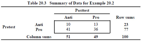 In Example 20.2, the frequencies recorded in Cells b and c, respectively, represent subjects who are