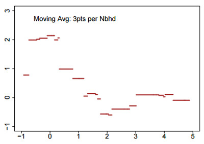 Moving averages use variable bins containing a fixed number of observations, rather than fixed-width bins with a variable number of observations. They tend to wiggle near the center of the data, but flatten out near the boundary of the data.