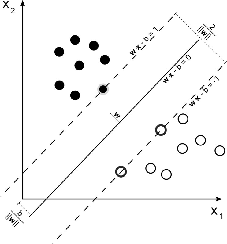 “Minimize $|{\vec{w}}|$ subject to $y_{i}({\vec{w}} \cdot {\vec{x}}_{i}-b) \geq 1$, for $i=1,\,\ldots ,\,n$”.