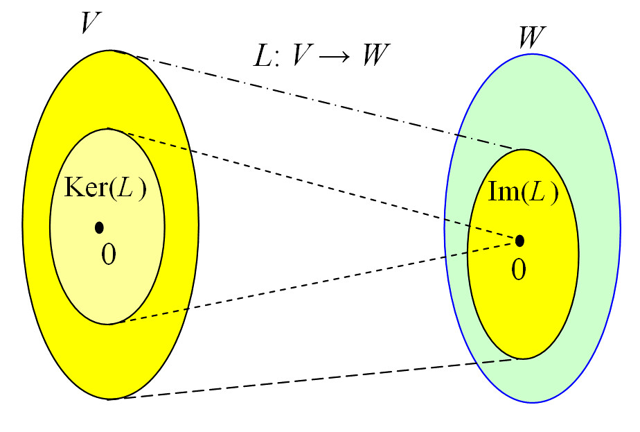 - The image of $L$ is $\mathrm{im}(L) = \left \{ L(\mathbf{v}) \mid \mathbf{v} \in V \right \}$ (所以 $\mathrm{im}(L)$ 是 $W$ 的子空间)