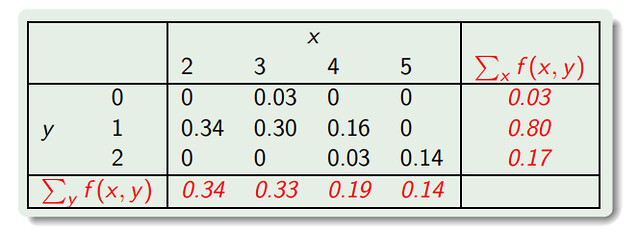 - Marginal distribution of $X$ 其实就是 $X$’s individual distribution,它只在 joint distribution 这个 context 下有意义。语出二维的 discrete joint distribution table,比如: