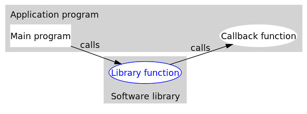 从这个解释和图来看,callback function 的指针会传递给 library function,然后 library function calls callback function, from library level back to appliaction level。callback function 实质是被回调的函数。