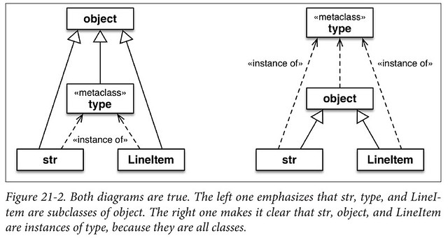 The classes object and type have a unique relationship: object is an instance of type, and type is a subclass of object. This relationship is “magic”: it cannot be expressed in Python because either class would have to exist before the other could be defined.