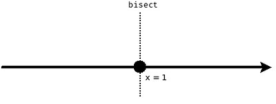 几何学上的概念是简单的。比如我有一个 $x$-axis,或者直线 $(-\infty, +\infty)$,我在 $x=1$ 处切一刀,就做了一个 bisection,直线 $x=1$ 即是 bisector,如下图: