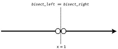 那从另外一个角度来说,如果直线上不存在 $x=1$ 这个点,比如说变成两条射线 $(-\infty, 1) \cup (1, +\infty)$,那么自然就不用管 $x=1$ 这个点的归属问题了。这个时候 bisect_left(X, 1) == bisect_right(X, 1):