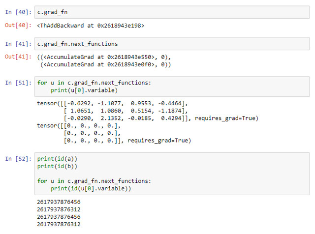 c.grad_fn.next_functions 这棵 tree,唯一可能的构建时间是在 c = a + b。我猜测是 PyTorch 是 overload 了 Tensor 的 +,但是这一点有点难验证,原因: