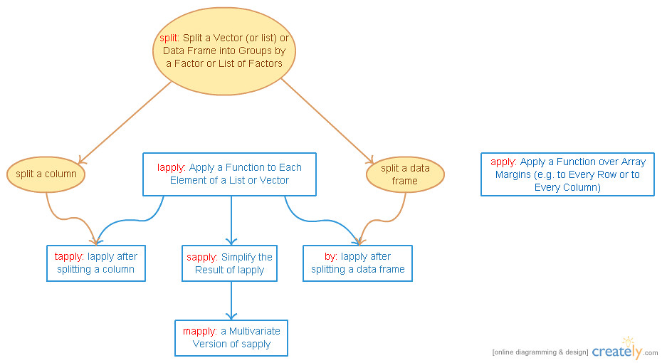 说白了就是 tapply(X, INDEX, fun) == lapply(split(X, INDEX), fun),我们先用 split 来对某一个 column 做 grouping,得到一个 list of vectors,也就是 list of groups,然后对这个 list of groups 做 lapply