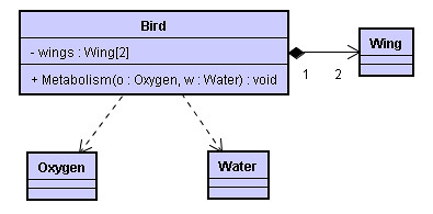 依赖表示一种 “需要” 的关系,但一般被依赖的对象 B 不是对象 A 的成员。如上图所示,鸟的新陈代谢需要氧气和水,但氧气和水都不会是鸟的成员。依赖和关联的区别大抵体现于此。